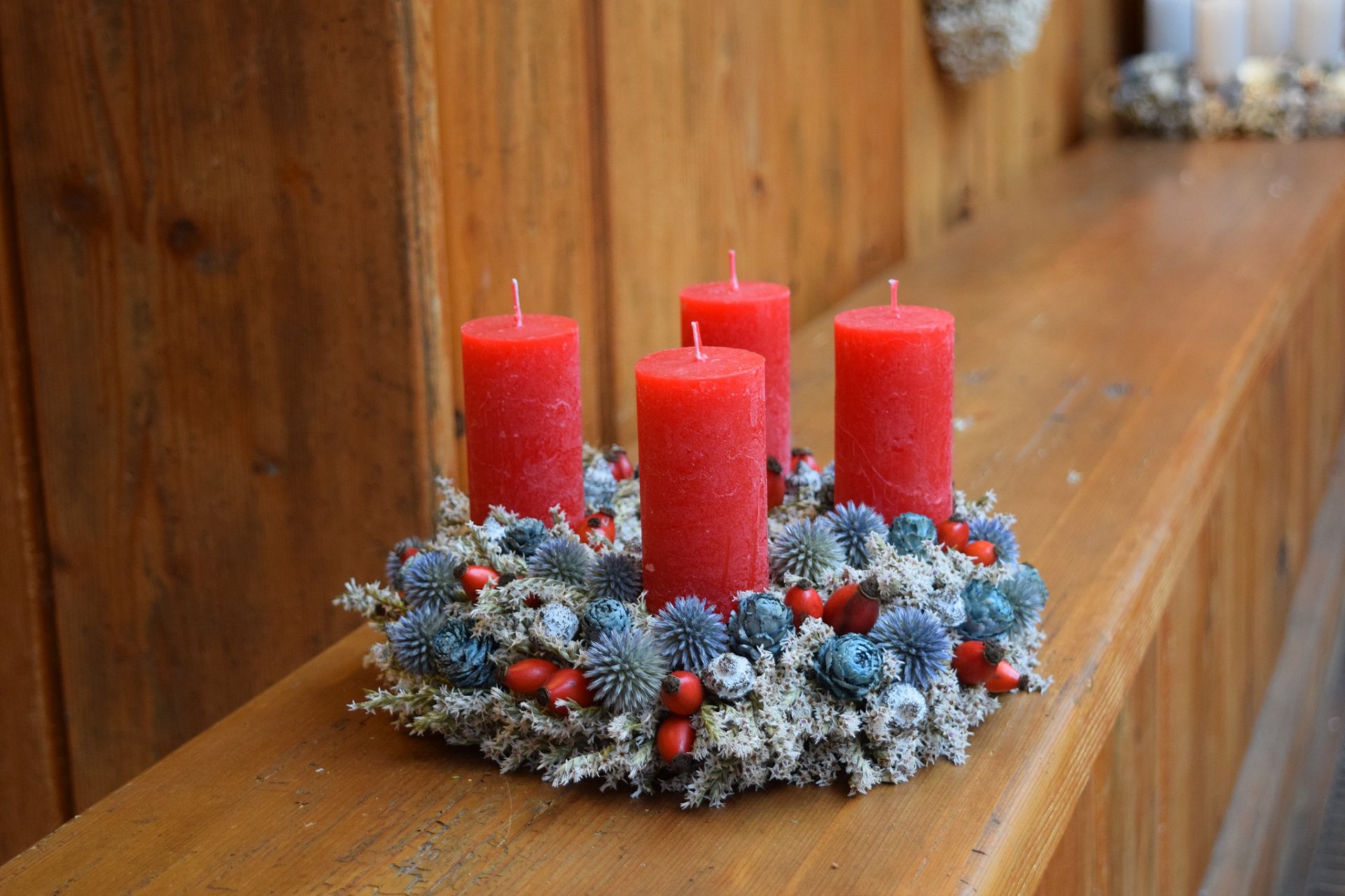 Piros gyertyás adventi koszorú szamárkenyérrel